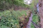Côté extérieur, un terrain de 643 m² à nettoyer avec ruisseau en bordure.
