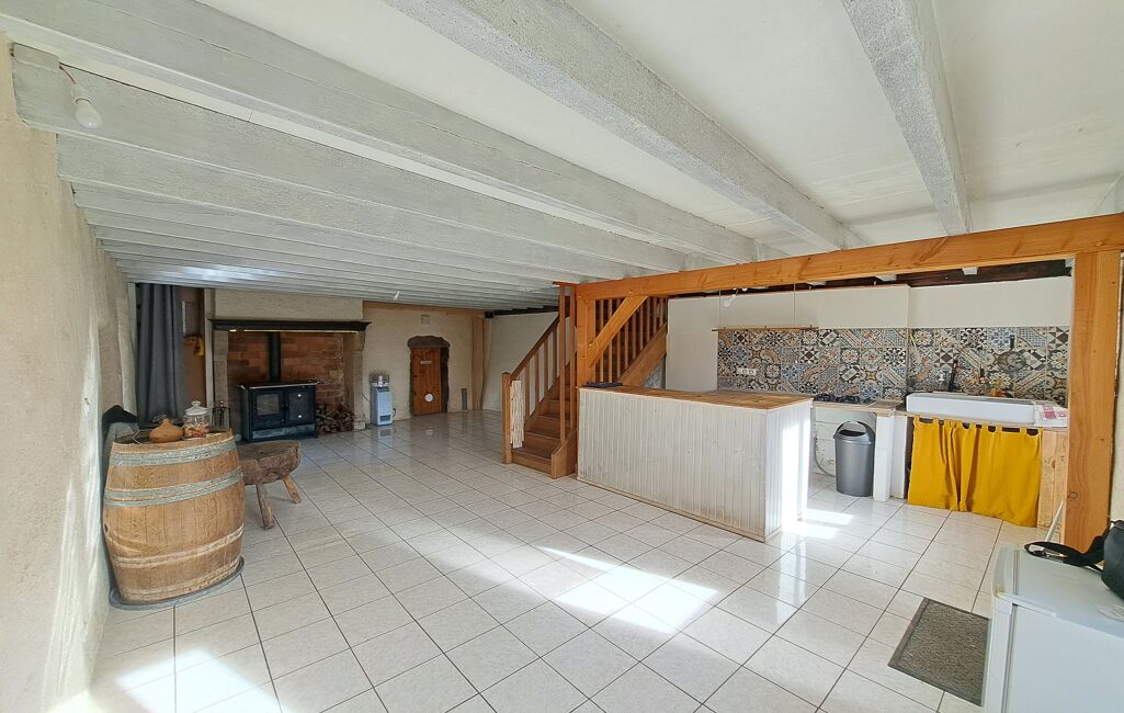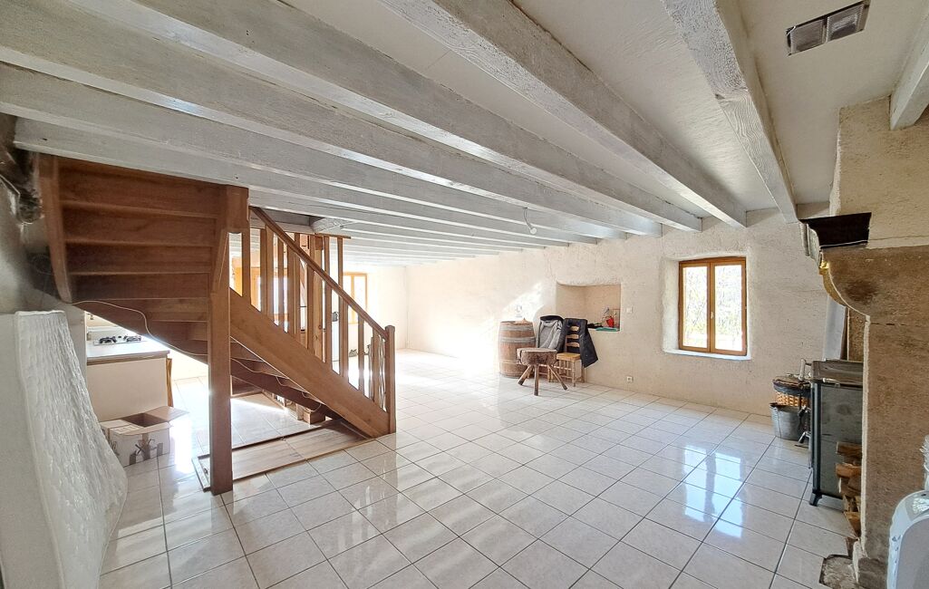 Au rez-de-chaussée, une spacieuse pièce de vie salon/salle à manger/cuisine d’environ 50 m² avec son fourneau bois et une jolie cave voutée de 8 m²