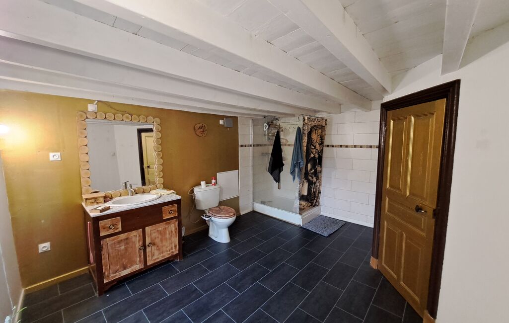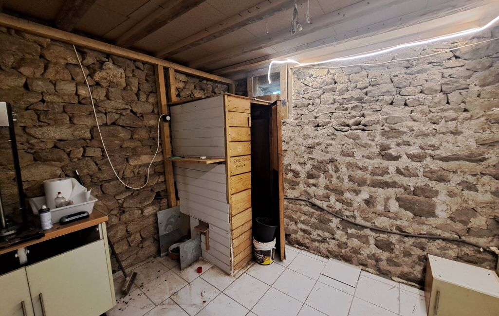 Au rez-de-chaussée, une spacieuse pièce de vie salon/salle à manger/cuisine d’environ 50 m² avec son fourneau bois et une jolie cave voutée de 8 m²